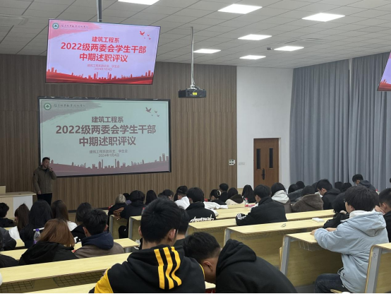 本网讯/为进一步规范我校学生组织工作制度化、规范化,更好地履职尽责,提升学生干部素养,坚持从同学中来到同学中去,更好的服务青年学生成长成才,2024年1月4日晚,在阶梯教室二举办了建筑工程系2022级两委会学生干部中期述职评议。本次述职评议由两委会主席团、各部门负责人分别代表各自分管部门进行述职,系党总支书记魏长专,系学生科科长兼团总支书记刘克芹及各辅导员老师担任评委,两委会各部门部员共同参与了评议。