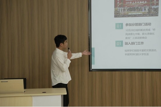 会议伊始,由主持人陈文静、黄伟龙介绍本次会议流程,并宣布会议正式开始。首先,各部门述职人员围绕重点工作开展讲述,对工作中存在不足、工作亮点、岗位重点工作经验总结、职务相关事务的思考建议等方面进行述职,脉络清晰,内容详实,充分展现出各学生组织的活力与创造力。接着主席团成员也分别从个人基本情况、工作成效与总结,较为详细地汇报了本学期的工作概况。两委会干部们此次述职,既是在回顾中总结经验,也是对工作进行了交流,有利于学生干部工作水平和整体素质的提升,强化各部门的职责观念。随后老师评委们分别根据报告内容、现场表达、综合印象等方面进行全面客观的综合打分。