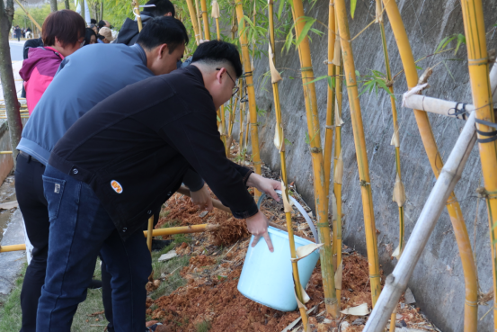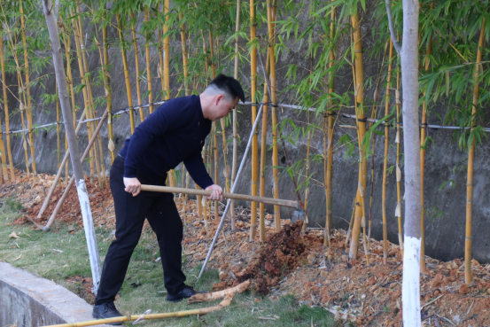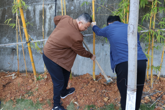 建筑工程党总支书记魏长专和系主任彭忠伟亲自带领全系教职工参与本次植树活动。活动现场,全系教职工热情高涨、分工明确、团结协作,共同完成了青丝黄竹的栽种工作。大家挥锨铲土、扶竹浇水,现场一片繁忙景象。本次植树活动不仅是建筑工程系重视劳动教育和职业素养培养的一次生动呈现,更是在实践中加深了对生态文明建设的理解。通过亲手栽种青丝黄竹,大家对“绿水青山就是金山银山”的发展理念更加认同,体会到了保护环境、珍惜资源的重要性。同时,此次活动增强了全系教职工的团队协作能力,也促进了教职工之间的交流与互动。
