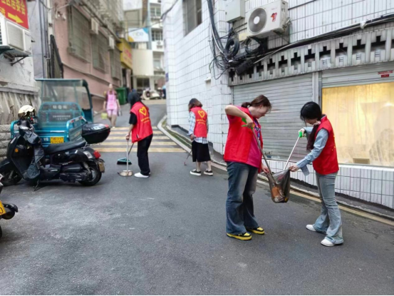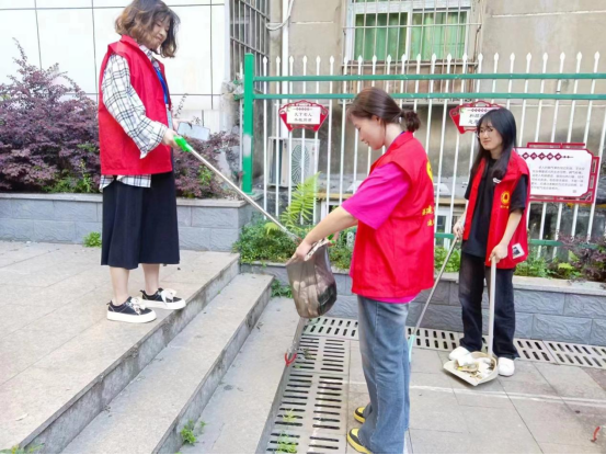 与此同时,另一批志愿者正有条不紊地进行垃圾清扫工作。他们手持工具与垃圾袋,两两配合,团结协作。他们聚焦卫生短板,针对道路、绿化带垃圾、楼道堆积物、广告宣传单等问题进行全面的排查与清理。