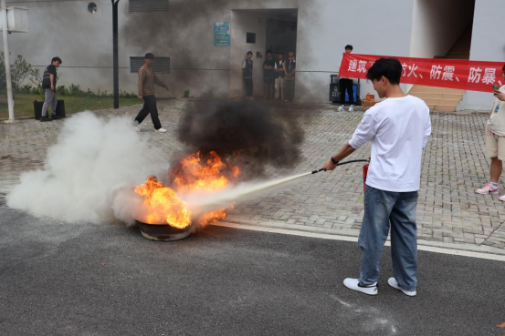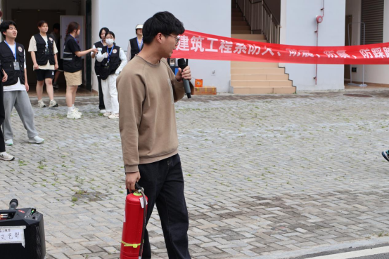 接下来由院安保处李靖瑜老师详细讲解了灭火器使用的注意要点,并对每一个环节的操作进行了说明,用“一提、二拔、三握、四压”的规范动作现场演示了干粉灭火器的正确使用方法。随后,随机挑选了几名同学轮流用干粉灭火器模拟现场灭火。在演练过程中,李靖瑜老师时刻关注学生的各项操作步骤,及时在现场给予指导和纠正。