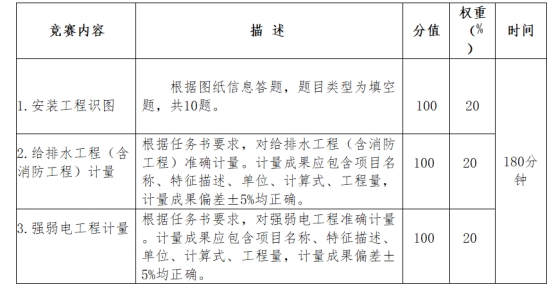 要求参赛学生掌握计算机辅助制图的方法和技巧,能编制施工进度计划,能使用CAD解决绘制图纸时遇到的各种问题,具备建筑智能化系统的识图、绘图、出图能力。竞赛时间为 60 分钟。