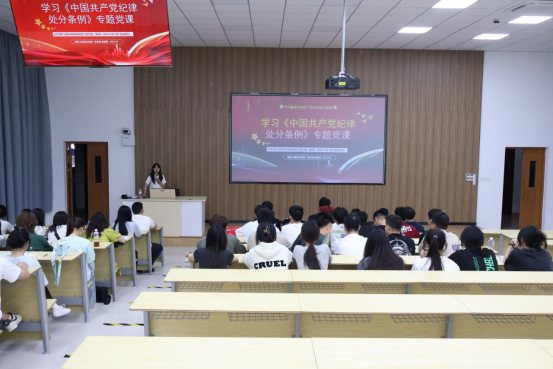 党课上,陈慧婷老师带领全体党员、入党积极分子一同回顾了《条例》的修订历程。紧接着,陈慧婷书记结合自身对《中国共产党纪律处分条例》的学习感悟,分别从“修订的主要内容”、“修订的重要意义”、“修订的亮点解读”、“推进党的自我革命”四个方面对《条例》进行了出浅入深的解读。她强调,此次《条例》修订着眼解决大党独有难题、健全全面从严治党体系,我们要增强学纪意识,自觉地学习《条例》,并与学习党的二十大精神相结合,注重提高思想道德建设,深刻领会《条例》的意义,进一步增强党性,严守纪律,持续发挥党员的先锋模范作用。