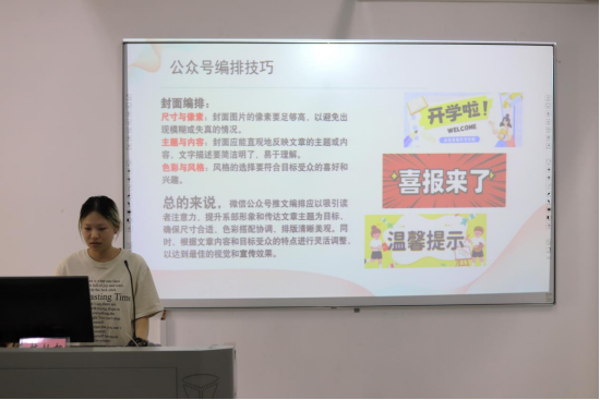 记者站负责人陈佳豪讲述了媒体宣传在品牌建设中的重要性,强调了新闻稿的撰写技巧和拍摄技巧及点位等传播策略。新媒体中心负责人钱晓意则分享了如何进行宣传排版和利用社交媒体平台提升品牌影响力,以及如何与受众进行有效互动。宣传部负责人刘静文则从视觉设计的海报和集体、个人形象角度出发,依次讲解了如何通过创意的视觉元素来塑造品牌形象,以及通过彰显集体形象或个人形象侧面达到宣传的效果。培训现场气氛热烈,互动频繁,展现出了建筑工程系学生干部积极向上、勤奋好学的精神风貌。