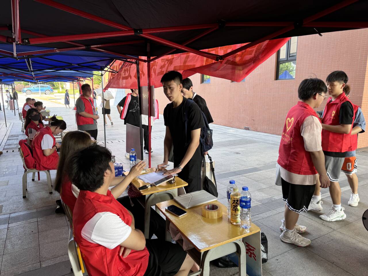 校园里,志愿者们早早地就忙碌起来。他们身着统一的服装,脸上洋溢着热情的笑容,在学校的各个角落迎接新同学的到来。从校门口到报到处,从宿舍区到教学楼,志愿者们的身影无处不在。他们主动上前帮忙提行李,耐心地解答新同学和家长们的各种问题,为初来乍到的新生们指引方向。