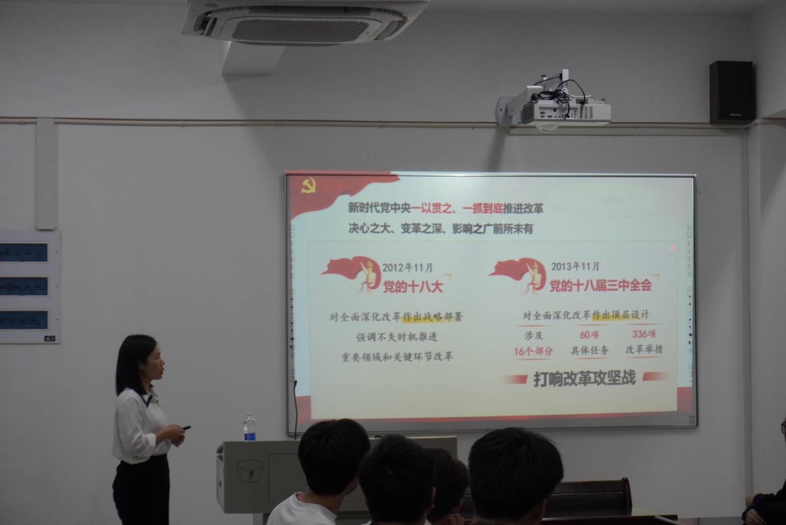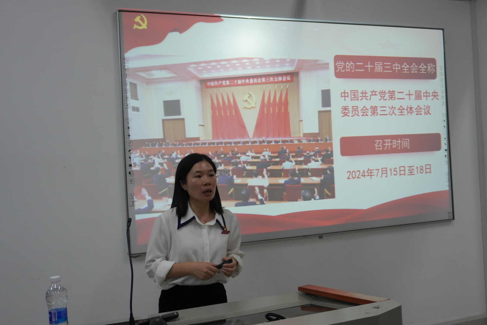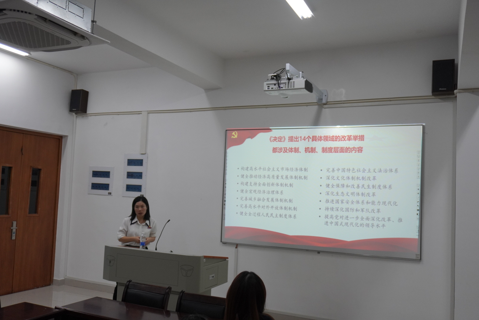 讲授过程中,陆晓莉副院长带领在座学生入党积极分子回顾了党的十八大以来的改革推进进程。她表示,新时代党中央一以贯之、一抓到底推进改革,决心之大、变革之深、影响之广前所未有。党的二十届三中全会站在新的历史起点上,科学谋划,提出进一步全面深化改革的任务同党的二十大作出的战略安排相匹配、相衔接,以5年为期,稳扎稳打,有步骤、有重点地抓好落实,将使中国改革开放矗立起新的里程碑。陆副院长从14个具体领域的改革举措,阐明了党的二十届三中全会通过的《中共中央关于进一步全面深化改革、推进中国式现代化的决定》的具体内容,引导学生把握《决定》的主旨要义。同时,她还带领与会学生重点学习了“七个聚焦”的具体内涵。她强调,“七个聚焦”指明了进一步全面深化改革的重点和关键,是在全面深化改革总目标指导下的分领域、有重点地统筹部署、集中视角、突出焦点和导向呈现。全方位分重点有层次引导学生把握党的二十届三中全会精神的主旨要义。鼓励学生多读《决定》,悟通悟透党的二十届三中全会精神,努力成长为可担大任的时代新人。