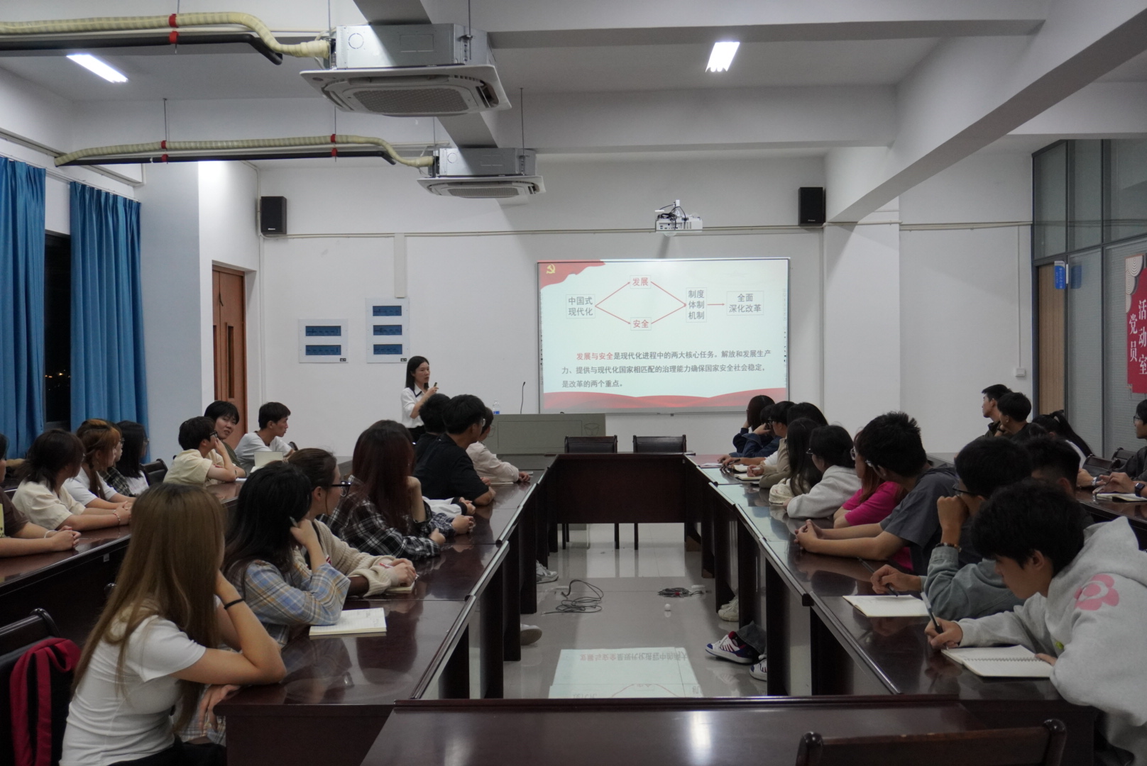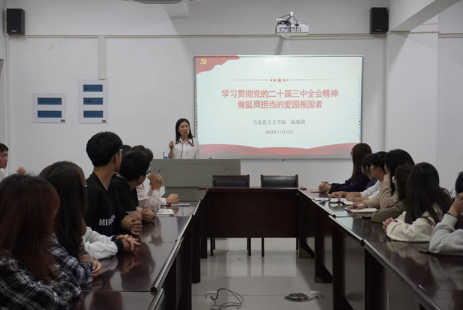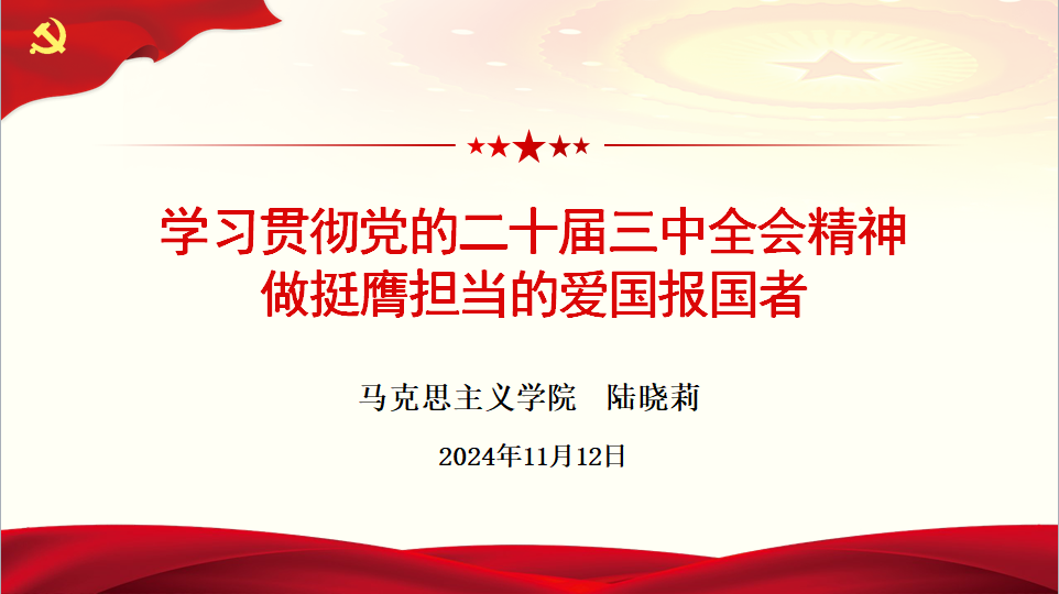 本网讯/为进一步学习宣传党的二十届三中全会精神,引导新时代青年大学生坚定理想信念,争做挺膺担当的爱国报国者,2024年11月12日晚上7点,马克思主义学院副院长陆晓莉在建工楼502会议室为全系学生入党积极分子讲授“学习贯彻党的二十届三中全会精神,做挺膺担当的爱国报国者”主旨讲座。