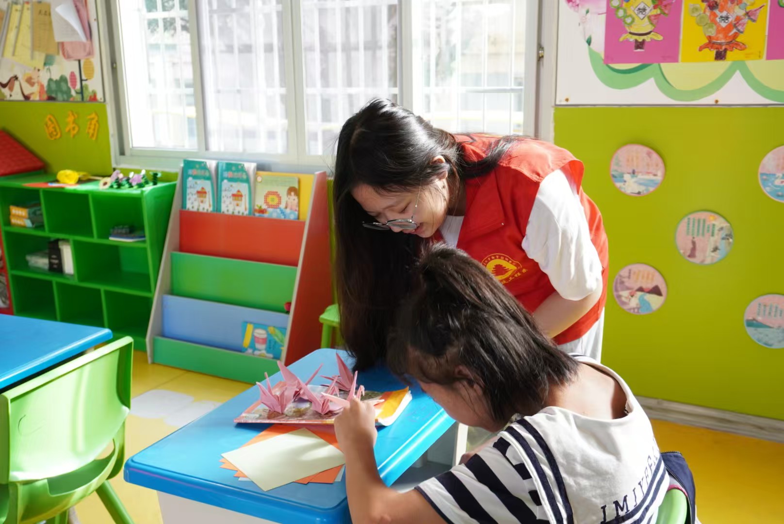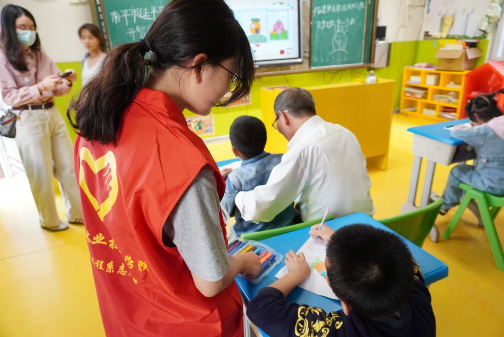 美术课上,志愿者们耐心细致地与小朋友们共同创作。他们温柔的指导,如同点点星光,照亮孩子们创作的道路。孩子们用稚嫩的小手挥舞着画笔,在纸上留下童真的印记。一幅幅画如心灵之窗,呈现出孩子们五彩斑斓的世界。这里有奇思妙想的冒险,有对未来的憧憬,每一幅都熠熠生辉,这些画作是他们内心最纯真的表达,也是送给世界的珍贵礼物。