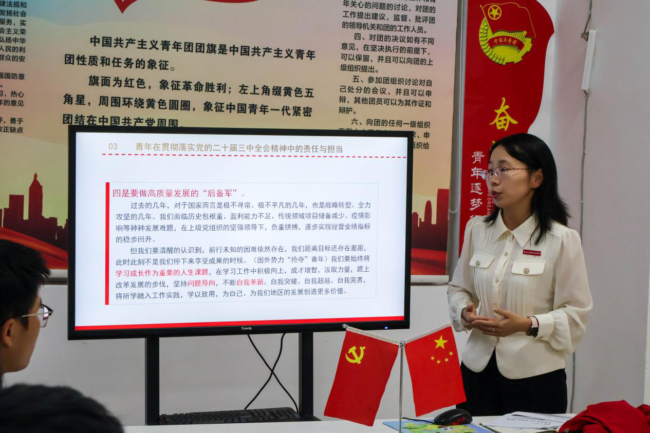 随后,刘克芹老师对功能型团支部开展团日活动的情况予以充分肯定,并为团支部同学们讲授学习党的二十届三中全会精神主题团课。刘克芹老师着重强调,作为团员青年,应深入学习党的二十届三中全会精神,坚定在新时代新征程中勇担使命、积极作为的决心与信心。从深刻认识党的二十届三中全会的重大意义、准确把握其精神实质,到明确青年在贯彻落实会议精神中的责任与担当,刘克芹老师都进行了深入的解读与宣讲。刘克芹老师特别指出,党的二十届三中全会是在以中国式现代化全面推进强国建设、民族复兴伟业的关键时期召开的重要会议。团员青年应当争做社会主义的 “接班人”、挺膺担当的 “奋斗者”、改革创新的 “新青年”、高质量发展的 “后备军”,勇挑重担、积极作为,为进一步全面深化改革、推进中国式现代化贡献自身力量。同学们正襟危坐,全神贯注地倾听讲解,纷纷立志为实现中华民族伟大复兴中国梦奉献青春力量。