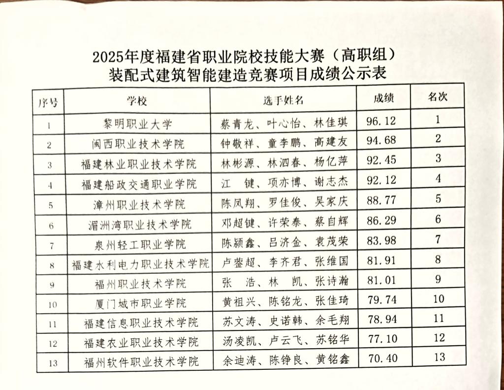 本网讯/在2025年3月5日于黎明职业大学举行的2025年度福建省职业院校技能大赛(高职组)装配式建筑智能建造竞赛项目中,我系学子表现卓越,荣获团体二等奖(全省排名第三),为学校争得了荣誉。