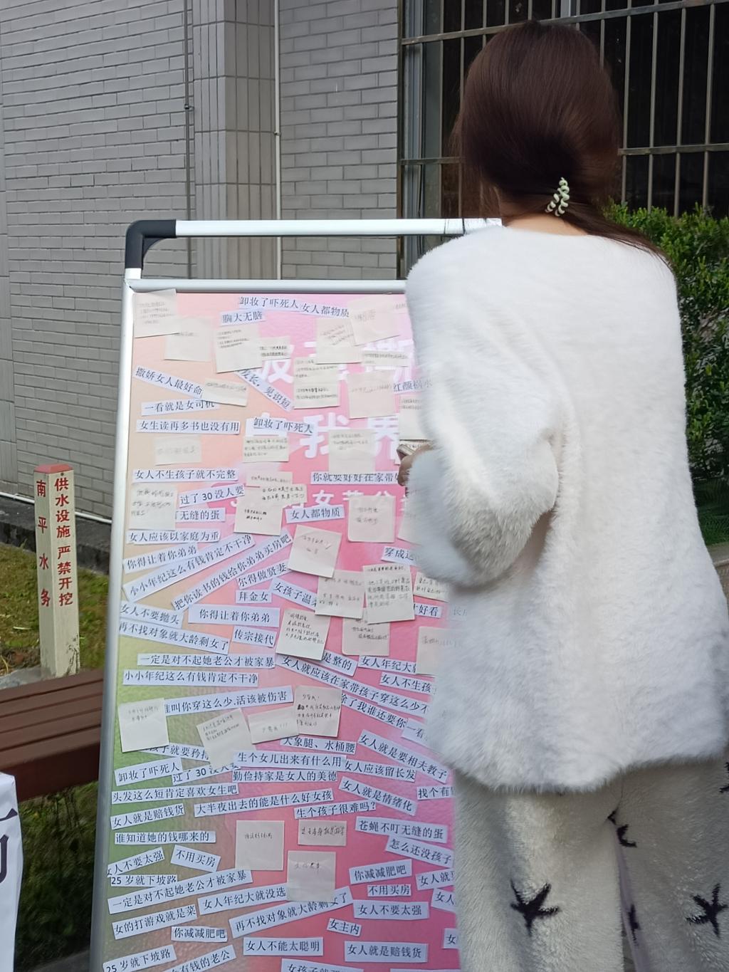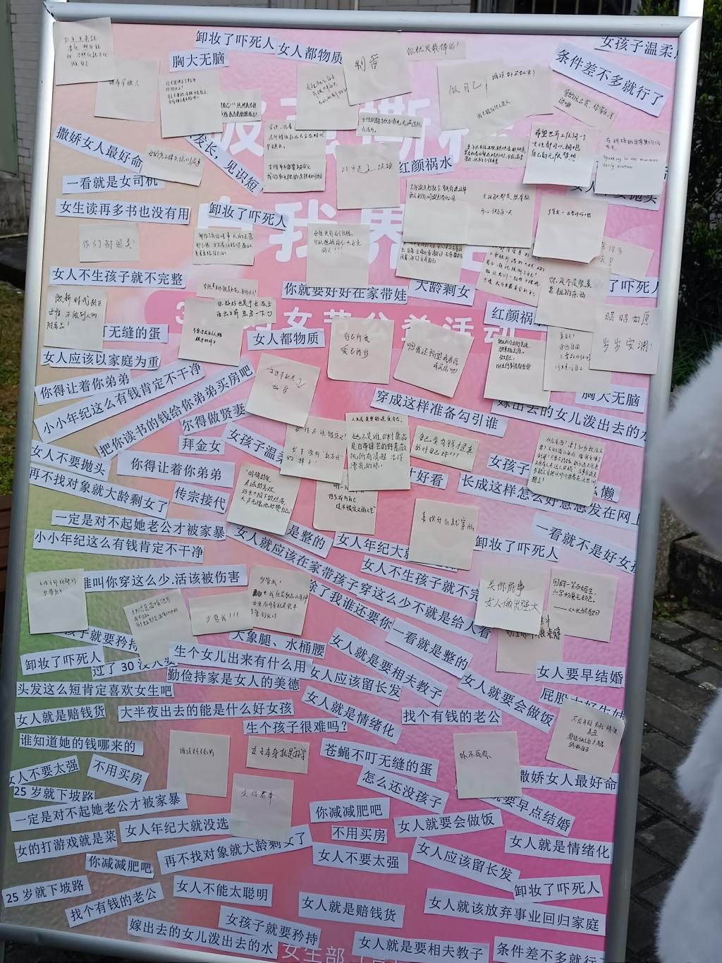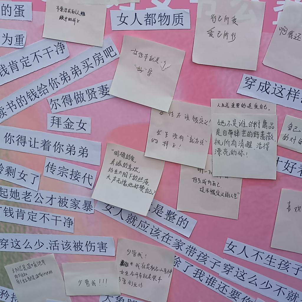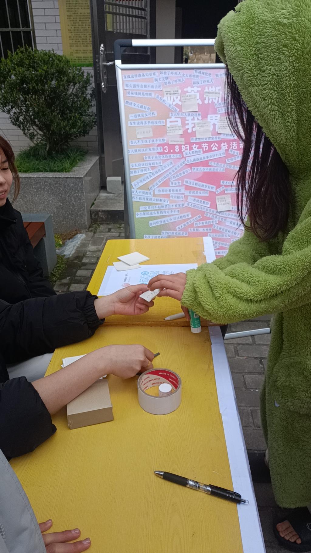 活动现场,一块特别的签名板吸引了众多同学的目光。五颜六色的手工扭花与承载着刻板印象的纸条相互映衬,同学们纷纷停下脚步,拿起笔,在签名板上郑重地写下自己的名字,随后伸手撕下那些束缚女性的刻板标签,宣告着对陈旧观念的挑战。撕掉标签后,大家写下对女性的美好祝福,如“人生最重要的是爱自己”、“祝你成为自己想要的模样”。