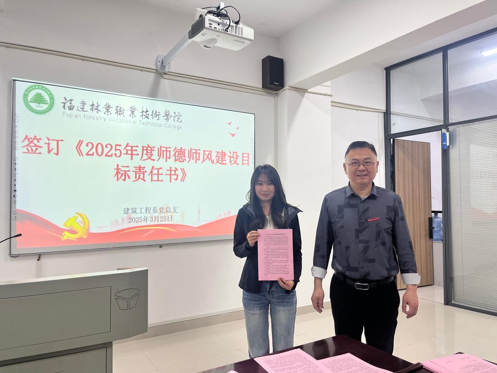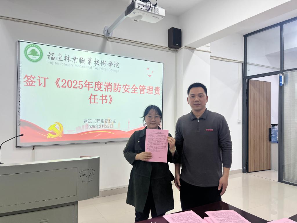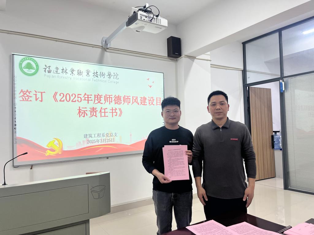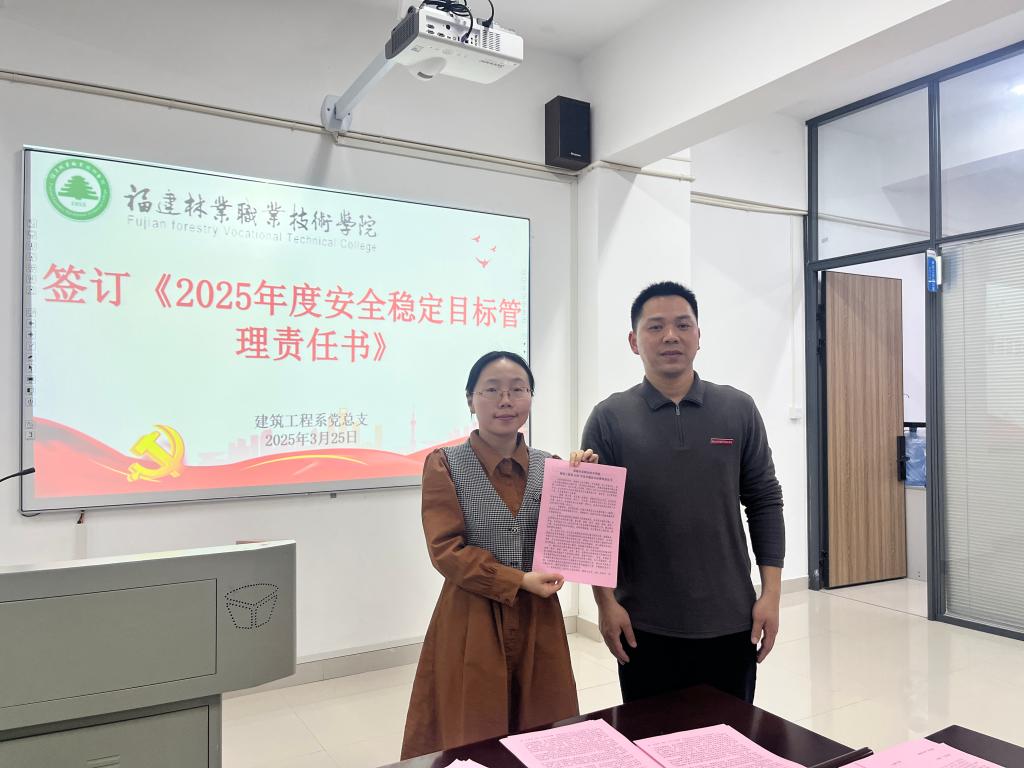 最后,建筑工程系党总支书记魏长专和系主任彭忠伟分别与教师们签订《2025年度安全稳定目标管理责任书》《2025年度消防安全责任书》《2025年度师德师风建设目标责任书》,通过签订责任书,全面落实校园安全工作责任制,将安全工作责任落实到岗到人。