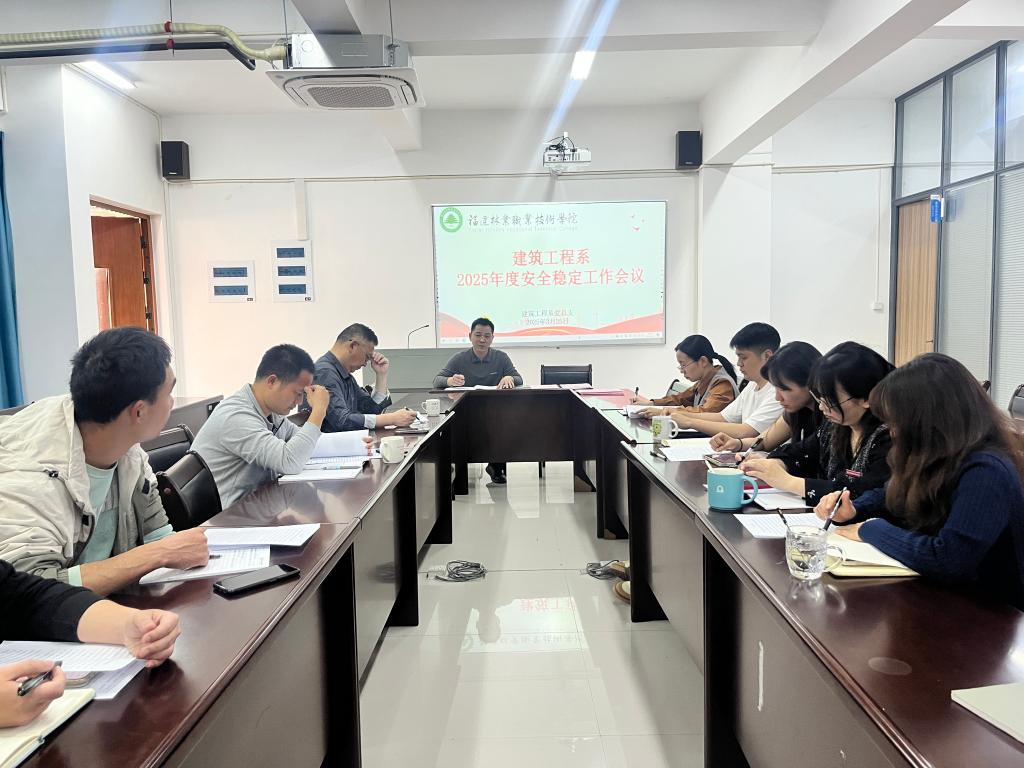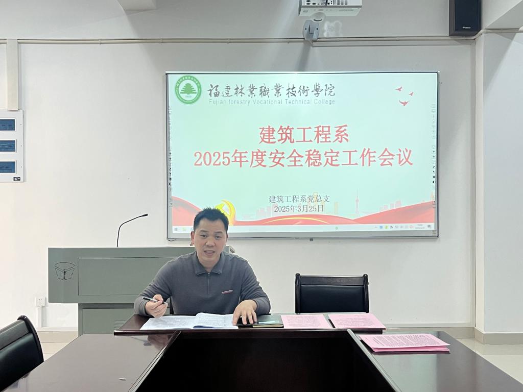 本网讯/为进一步夯实学校稳定安全工作基础,确保系部各项工作平稳有序,2025年3月25日,建筑工程系召开2025年安全稳定工作会议,学习传达上级安全稳定工作有关精神,分析当前系部安全稳定工作形势,研究部署2025年系部安全稳定工作。会议由建筑工程系党总支书记魏长专主持,建筑工程系全体教职工参会。