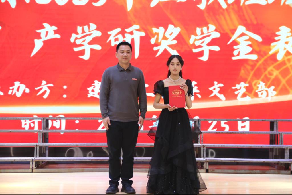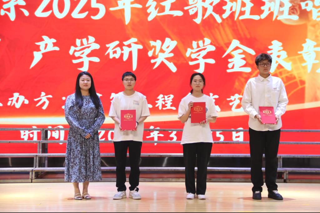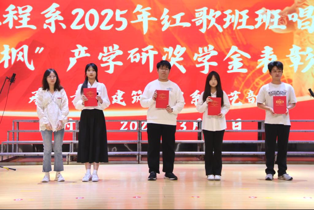 在红歌班班唱决赛热烈的氛围中,建筑工程系举行“红枫”产学研奖学金表彰仪式。“红枫”产学研奖学金由优秀校友林威向母校捐赠设立,旨在助力学子成长,推动学院产学研事业发展。