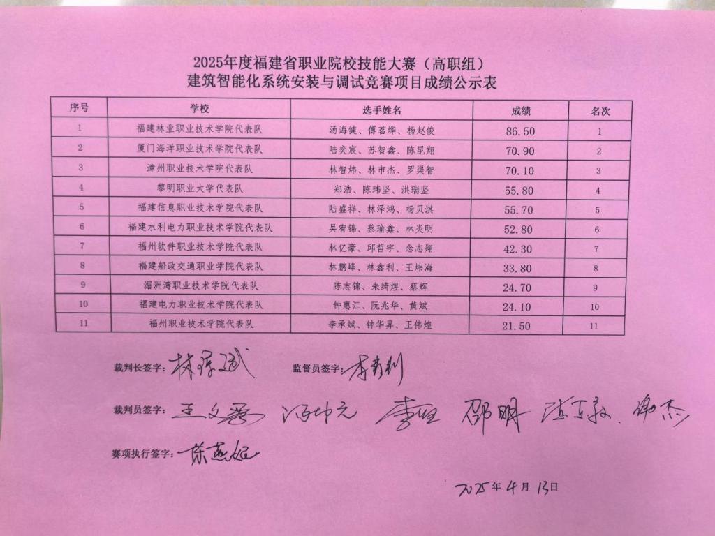 经过三天紧张激烈的角逐,由建筑工程系建筑智能化工程技术(五)2101班杨赵俊、汤海健与智能建造技术2302班傅茗烨组成的参赛团队以卓越表现勇夺2025年福建省职业院校技能大赛“建筑智能化系统安装与调试”赛项一等奖。