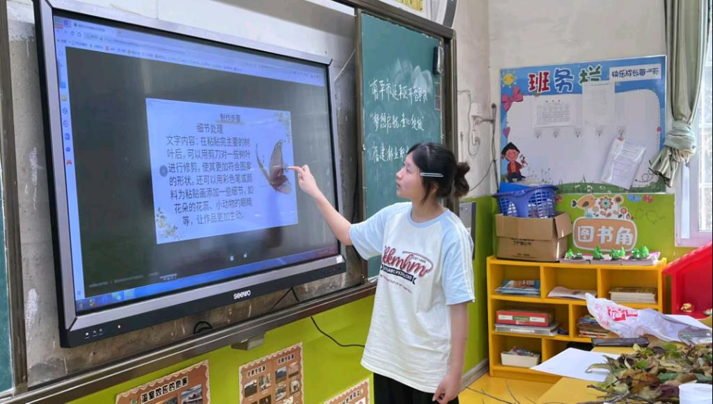 美术课上,志愿者们借助了多媒体设备,展示了他们精心挑选的风格各异的童趣作品,鲜艳的色彩瞬间抓住了孩子们的目光,志愿者们趁热打铁将绘画工具分发下去,引导孩子们用画笔描绘心中美好的世界。