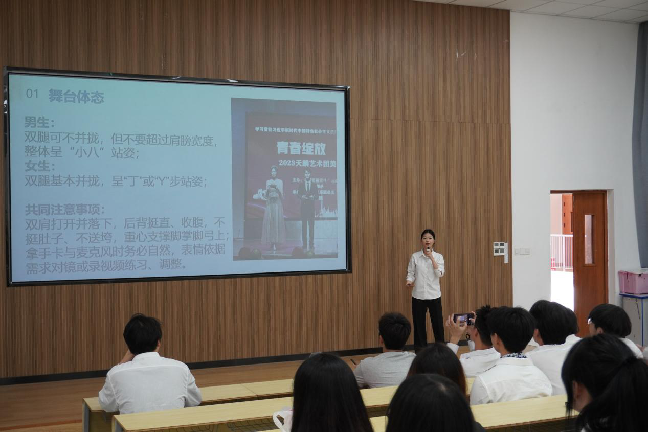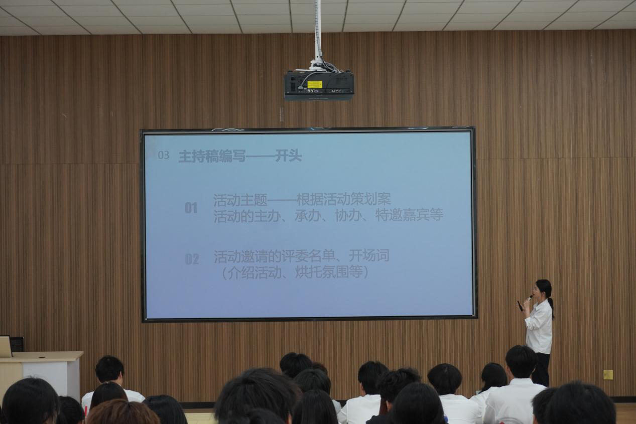 本网讯/为切实提升学生干部的语言表达与公共演讲能力,2025年5月27日,建筑工程系于阶梯教室二开展学生干部系列培训第三专题——“公共演讲技巧”专题培训。本次培训特邀天麟艺术团主持朗诵队队长陈佳颖担任主讲,通过理论剖析、实例示范相结合的形式,为参训学员带来一场精彩纷呈的演讲技巧提升课堂。
