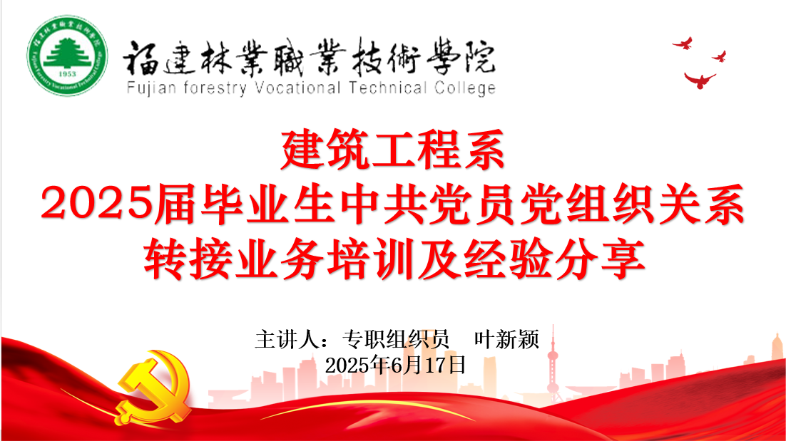 为协助毕业生党员及时转接党组织关系,进一步明晰党组织关系转接流程,专职组织员叶新颖开展了建筑工程系2025届毕业生中共党员党组织关系转接业务培训及经验分享会,旨在确保每一名毕业生离校后都能按规定纳入组织管理,及时高效“落户”。