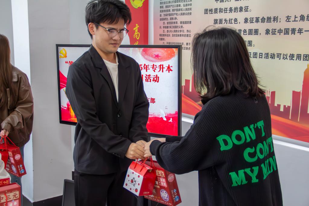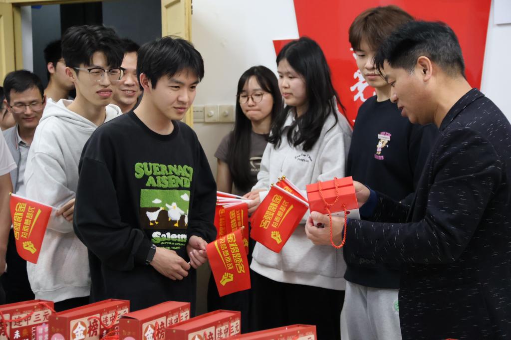 互赠寄语后,支部教师党员为考生党员发放“备考加油包”,内含金榜题名文具套装及柿柿如意陶瓷杯,承载着系部和组织满满的祝福和期望。同时为了打通组织关怀“最后一公里”,由学院党委副书记严绍裕、系党总支书记魏长专带队,支部教师党员深入学生宿舍“暖心送关怀”,除了送上“备考加油包”外,他们还和学生亲切交流,了解备考情况,给予备考建议,彰显党员的责任与担当。