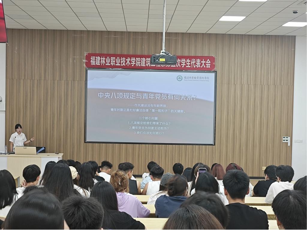 本网讯/为了深入学习贯彻习近平新时代中国特色社会主义思想,贯彻落实党的二十届三中全会精神,根据中共中央办公厅印发的《关于在全党开展深入贯彻中央八项规定精神学习教育的通知》,2025年6月25日,福建林业职业技术学院建筑工程系学生第一党支部在阶梯教室二开展《久久为功担使命,清风化入青春怀——从中央八项规定看新时代青年党员的作风锤炼与使命传承》专题党课。本次党课由建筑工程系学生第一党支部书记陈慧婷主讲,全体师生党员参加。