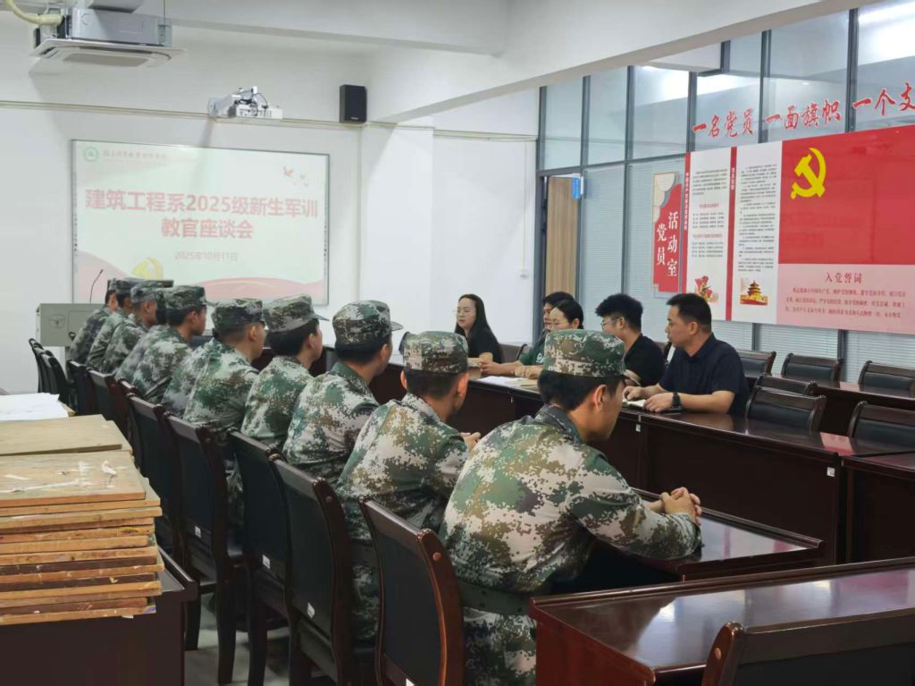 本网讯/10月11日,2025级新生军训教官座谈会在建工楼502举行。此次座谈会由建筑工程系党总支书记魏长专老师、学生科科长兼团总支书记刘克芹老师、2025级新生辅导员李楚楚老师、张道良老师和黄登峰老师以及2025级新生军训教官代表参加。