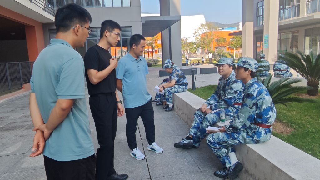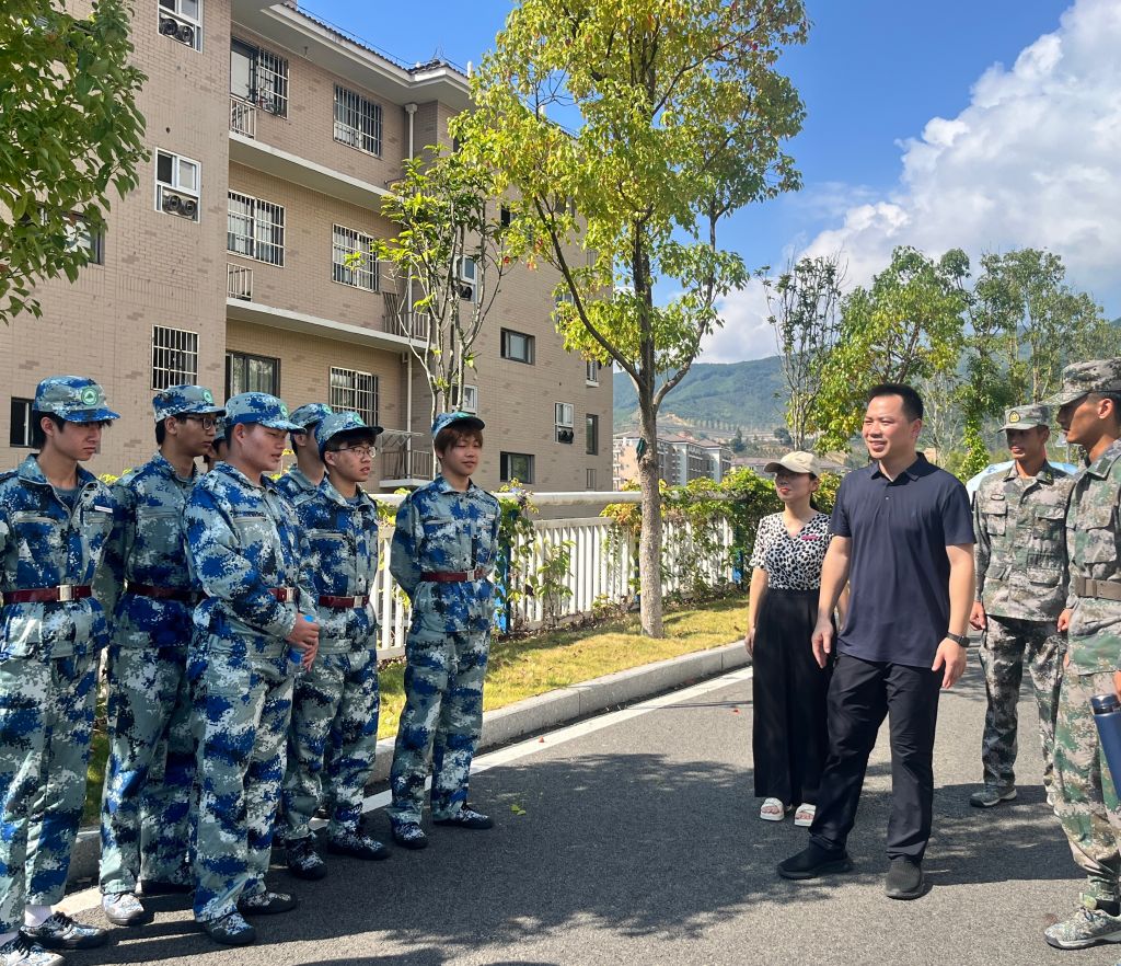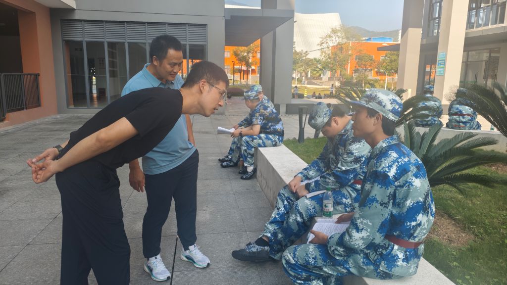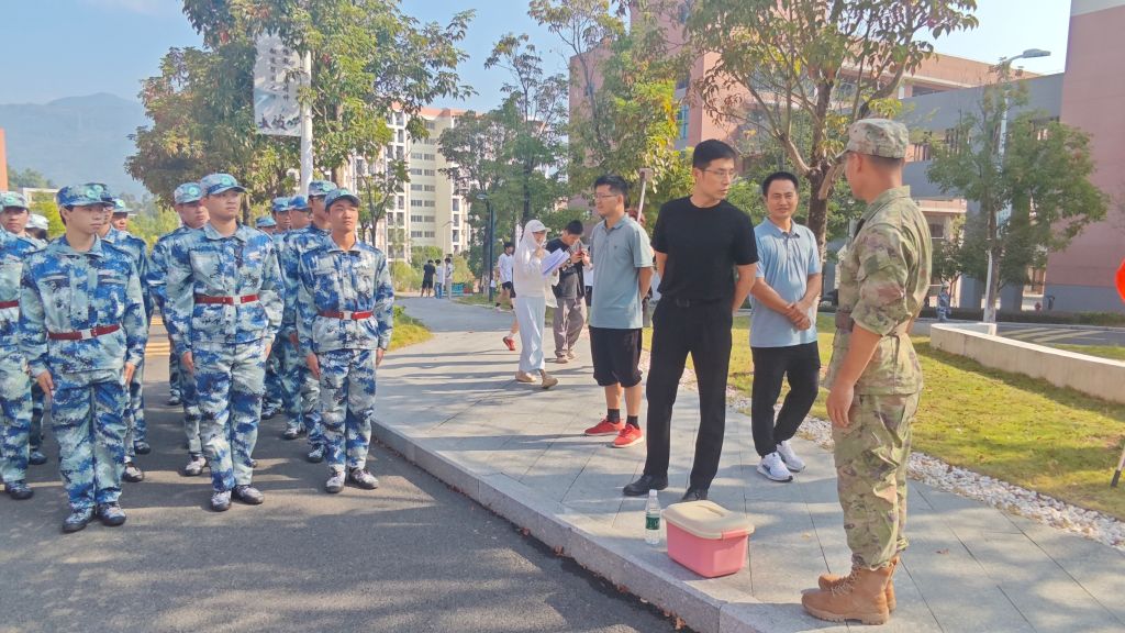 本网讯/2025年10月16日,建筑工程系党总支书记魏长专、系副主任张李平、系专职组织员叶新颖、系教务科科长廖坤阳、学生科科长兼团总支书记刘克芹及新生辅导员一行深入军训场地,亲切看望正在参加军训的2025级新生及教官,为烈日下坚持训练的学生送去关怀与鼓励。