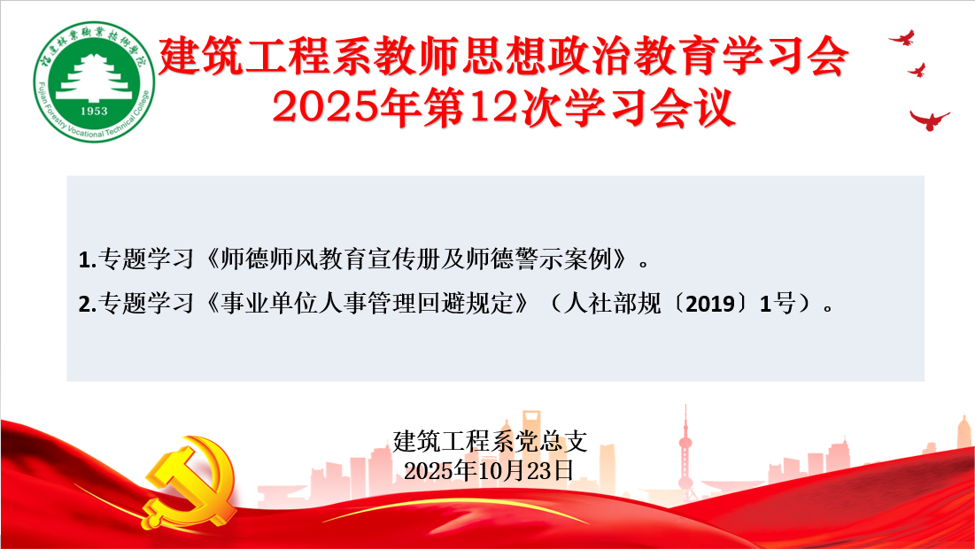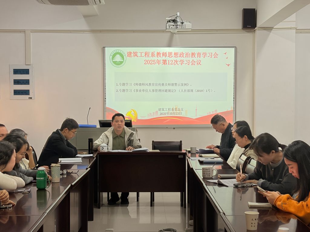本网讯/为进一步巩固深入贯彻中央八项规定精神学习教育成效,持续推进建筑工程系党风廉政建设,落实常态化开展师德师风警示教育要求,2025年10月23日下午,建筑工程系在建工楼502会议室组织召开师德师风警示教育会,会议由建筑工程系党总支书记魏长专主持,建筑工程系全体教职工出席会议。