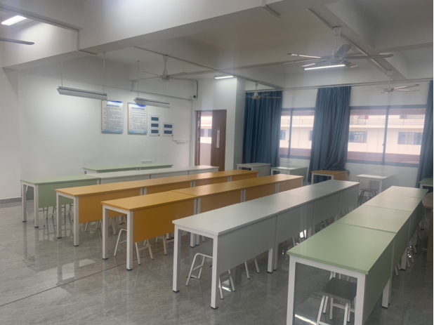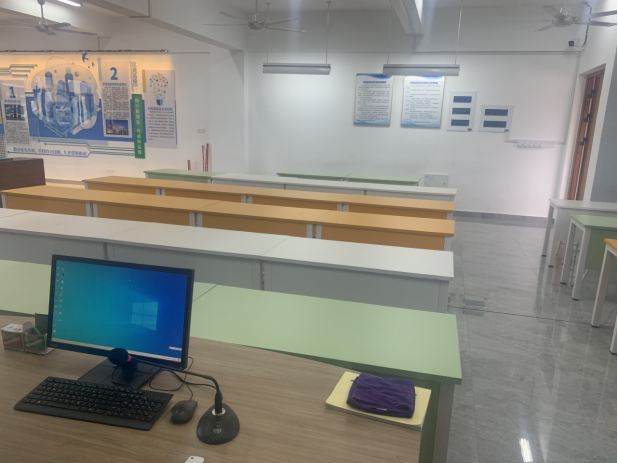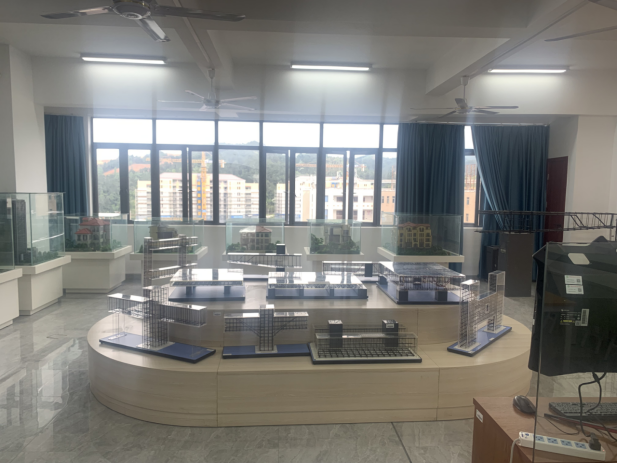 在实验室中部有一个大型柜子和椭圆形桌子,上面摆放着各种各样的小型建筑构造实物模型。在每个模型中,都严格按照建筑规范要求进行了钢筋布置。在教学中,可以利用这些模型进一步向学生们展示,让同学们更好的理解与掌握构造钢筋布置情况。同时在柜子的另一头,还设置了本实验室的文化背景墙,并在实验室最里边,摆放着7个装饰模型,当教师们一键打开这些模型与背景墙的灯光,在光与影的烘托下,十分美丽。这不仅可以让学生们更好的了解本实验室文化内涵,也进一步渲染了“建筑美”,激发学习兴趣,还有利于培养与提高学生们的“美育”。