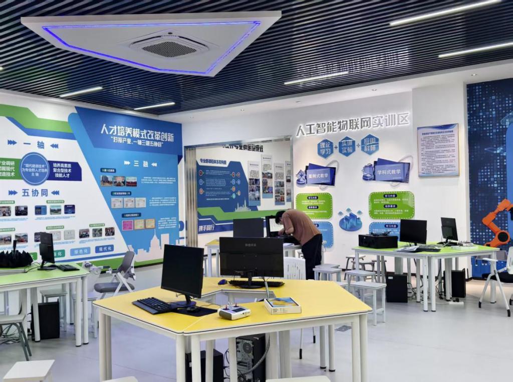 智能建造产教融合实训基地主要由智能建造机器人、智慧工地、装配式实训、实测实量等板块构成。主要设备设施有智能测量与智能建模系统、升降机监测系统、智能无人塔吊系统、高支模监测系统、智能建造喷涂机器人、智能建造地砖铺贴机器人、智能建筑机器人综合实训平台、预制构件装配工位及相应配套软件等。可进行智能机器人施工实训、智慧工地管理实训、装配式施工实训、实测实量实训、智能无人塔吊实训等技能训练,完全满足《智能机械与机器人》、《装配式智能建造技术》、《工程项目智慧管理》、《智能检测与监测技术》《建筑施工技术》、《施工组织与管理》、《室内设计原理》等课程的实训实习教学需要。