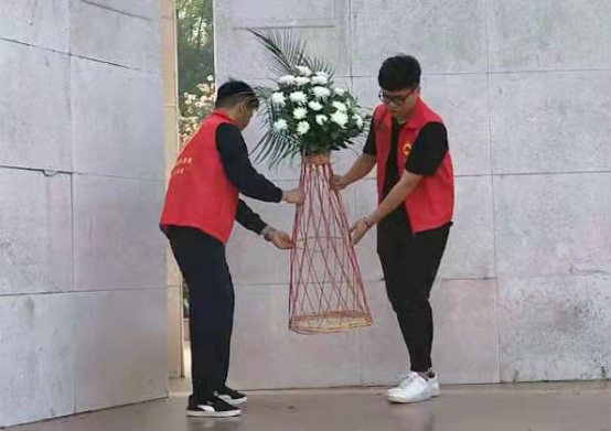 第二项仪式:由学生会主席何文强与副主席周彬彬向英雄纪念碑敬献花蓝。