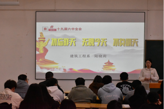 本网讯/为深入学习贯彻党的十九届六中全会精神,充分认识党的百年奋斗的伟大成就和历史经验,深刻理解当今世界百年未有之大变局的理论内涵和演进趋势,11月26日中午11:45,建筑工程系在实训四410教室召开“勿忘昨天 无愧今天 不负明天”暨学习贯彻党的十九届六中全会精神主题会议。建筑工程系学生科科长兼团总支书记陆晓莉以及全体两委会干部出席了本次会议。本次会议由陆晓莉老师主讲。