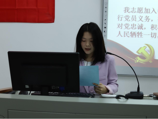 随后,预备党员代表吴乐嘉同志发言,她表示,入党宣誓是一名党员政治生命开始的象征,她将会永远记住这个神圣的时刻,把入党誓词作为自己终身的追求、终身的修养和终身的实践。同时,她说到,要深深地感谢党组织对他们的关心、培养和教育;感谢党组织的老师和老党员对他们的关爱、激励和帮助。将高举党的旗帜,用实际行动争做一名先进的共产党员,一名合格的共产党员!
