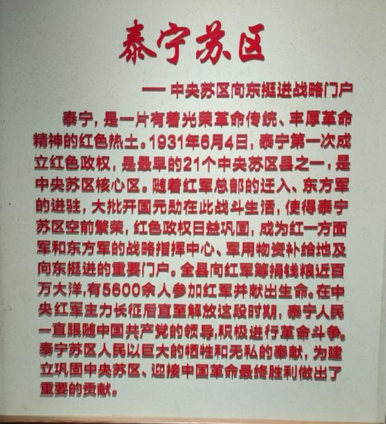 泰宁是一块具有革命历史的红土地,第二次国内革命战争时期,工农红军在此燃起了革命的烽火,建立了红色政权,中国工农红军总部就设在这里,朱德和周恩来等老一辈无产阶级革命家在此指挥红军作战,并一度成为闽赣省物资供应和经济文化建设的中心,是全国中央革命根据地二十一个苏区县之一,是中央苏区核心区。当前保存较好的红色地标有红军街、东方军陈列馆、红军标语墙旧址,是重要的青少年爱国主义教育基地。