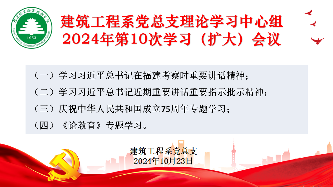 本网讯/2024年10月23日上午,建筑工程系党总支组织召开系党总支理论学习中心组2024年第10次学习(扩大)会议。巡听旁听组员党委组织部(统战部)部长李霞和党委宣传部综合科科长彭锦水莅临会议现场指导,全系全体学习中心组成员,3个党支部书记出席学习会,学习会由建筑工程系党总支书记魏长专领学。