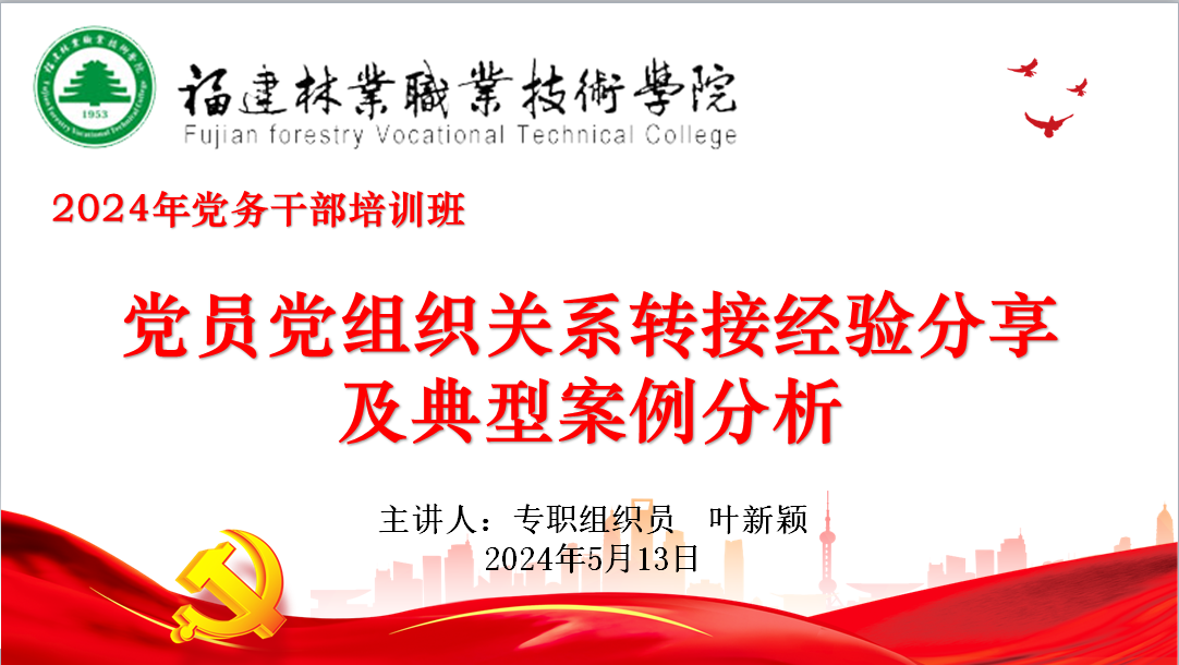 接着,专职组织员叶新颖同志以“党员党组织关系转接经验分享及典型案例分析”为主题开展具体业务培训,就党员组织关系转接原由、党员组织关系转接依据、关于转接党员组织关系介绍信情况说明、关于党员档案运输路径的情况说明、关于党员档案递交方式选择的情况说明、党员组织关系转接流程、毕业生党员组织关系办理注意事项、组织关系转接困难典型案例及其分析参考价值等八个方面主要内容进行详细讲解和培训。
