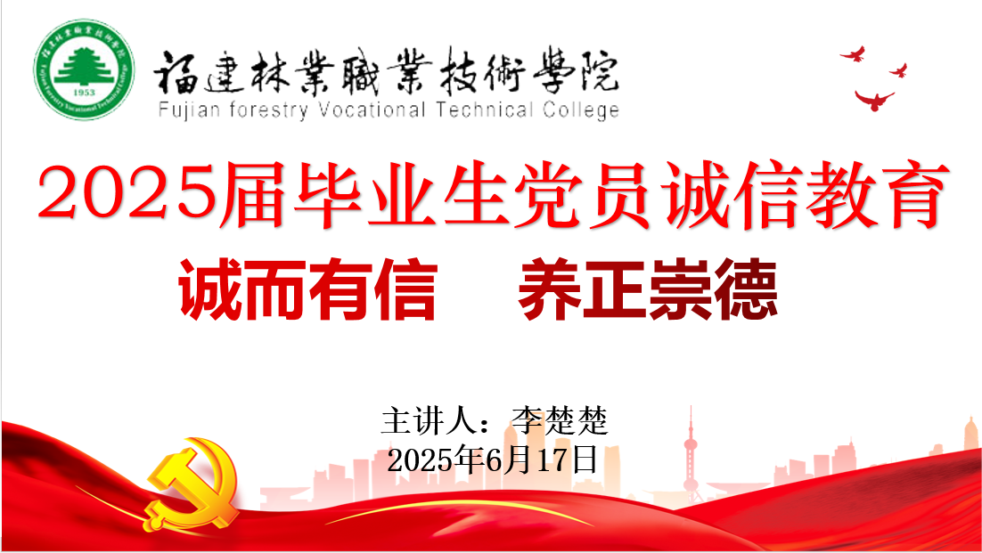 “人而无信,不知其可也。”诚信是古老的伦理道德规范,是最根本的道德原则和品质,是公民道德规范的基本要求。为即将离开校园、步入社会的毕业生党员上一堂简易而又深刻的诚信教育课,强调坚守诚信美德的重要意义,更好的助力毕业生党员早日融入社会,传播正能量,资助专员李楚楚老师以“诚而有信 养正崇德”主题为全系2025届毕业生党员开展一次诚信教育,她从生源地贷款诚信还款、诚信离校、诚信就业等三个方面引导,进一步深入引导全系全体毕业生党员诚信做人做事,友善待人,积极培育和践行社会主义核心价值观。
