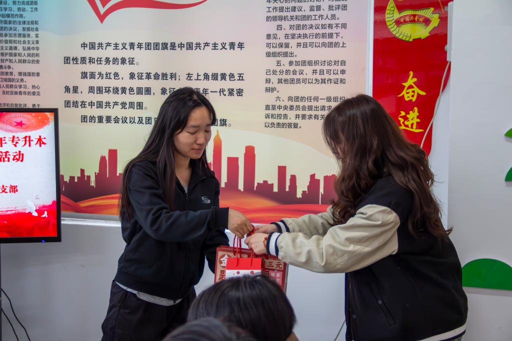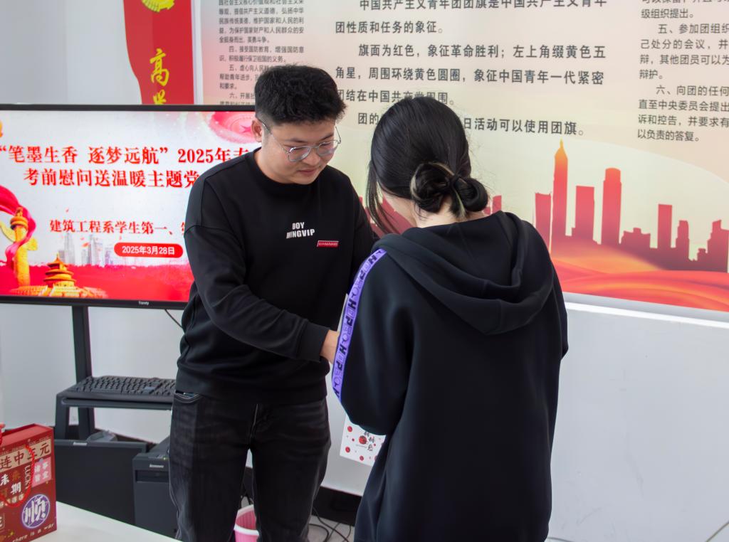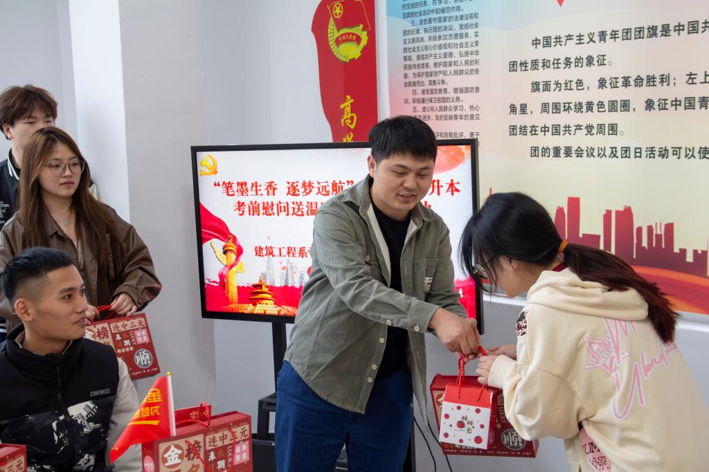 互赠寄语后,支部教师党员为考生党员发放“备考加油包”,内含金榜题名文具套装及柿柿如意陶瓷杯,承载着系部和组织满满的祝福和期望。同时为了打通组织关怀“最后一公里”,由学院党委副书记严绍裕、系党总支书记魏长专带队,支部教师党员深入学生宿舍“暖心送关怀”,除了送上“备考加油包”外,他们还和学生亲切交流,了解备考情况,给予备考建议,彰显党员的责任与担当。