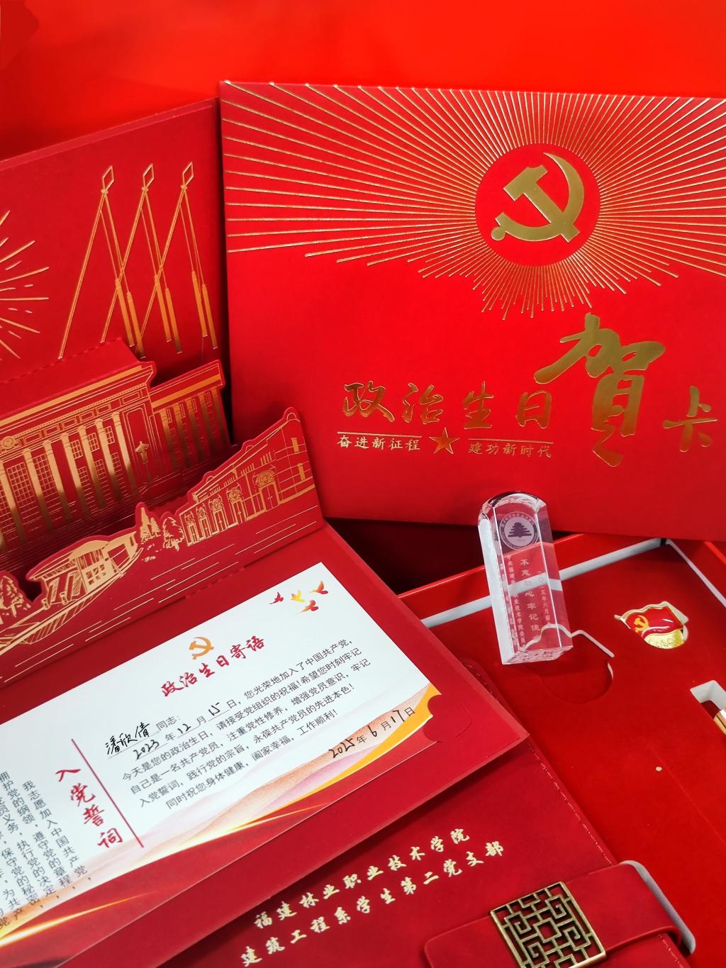 学生第二党支部书记张道良阐释了“政治生日”作为党性淬炼熔炉的意义,要求毕业生党员以“初心誓言”为镜,时时叩问“我是谁、入党为什么、为党做什么”。同时为43名毕业生党员送上了由党组织精心制作的载满祝福和希望的“政治生日”贺卡。贺卡是镌刻初心的“信仰密码”。它不仅是一张承载着入党日期、组织寄语的卡片,更是党组织与党员之间的“心灵契约”,象征着党员同志们自入党之日起,便矢志不渝地肩负起为党和人民事业不懈奋斗的神圣使命。