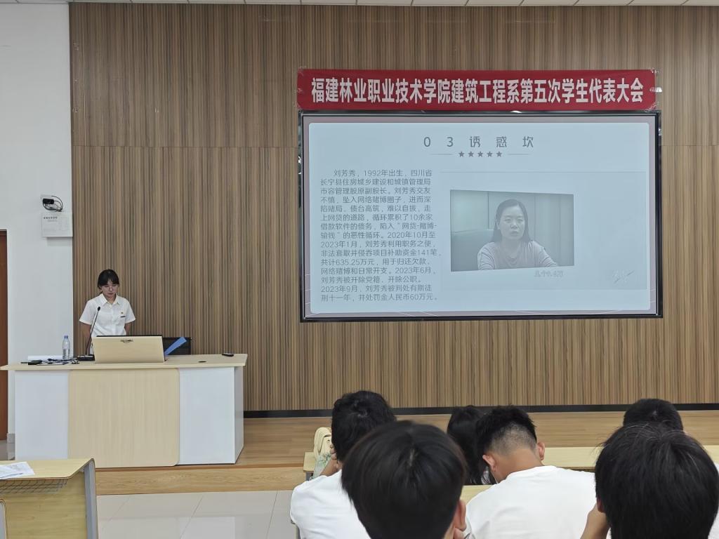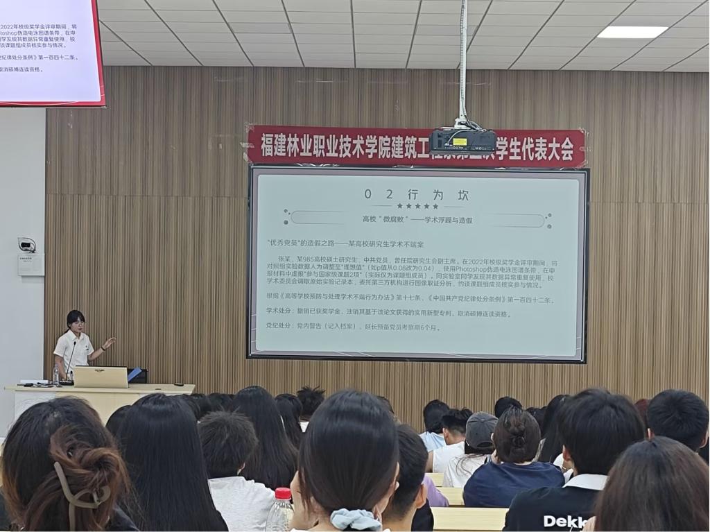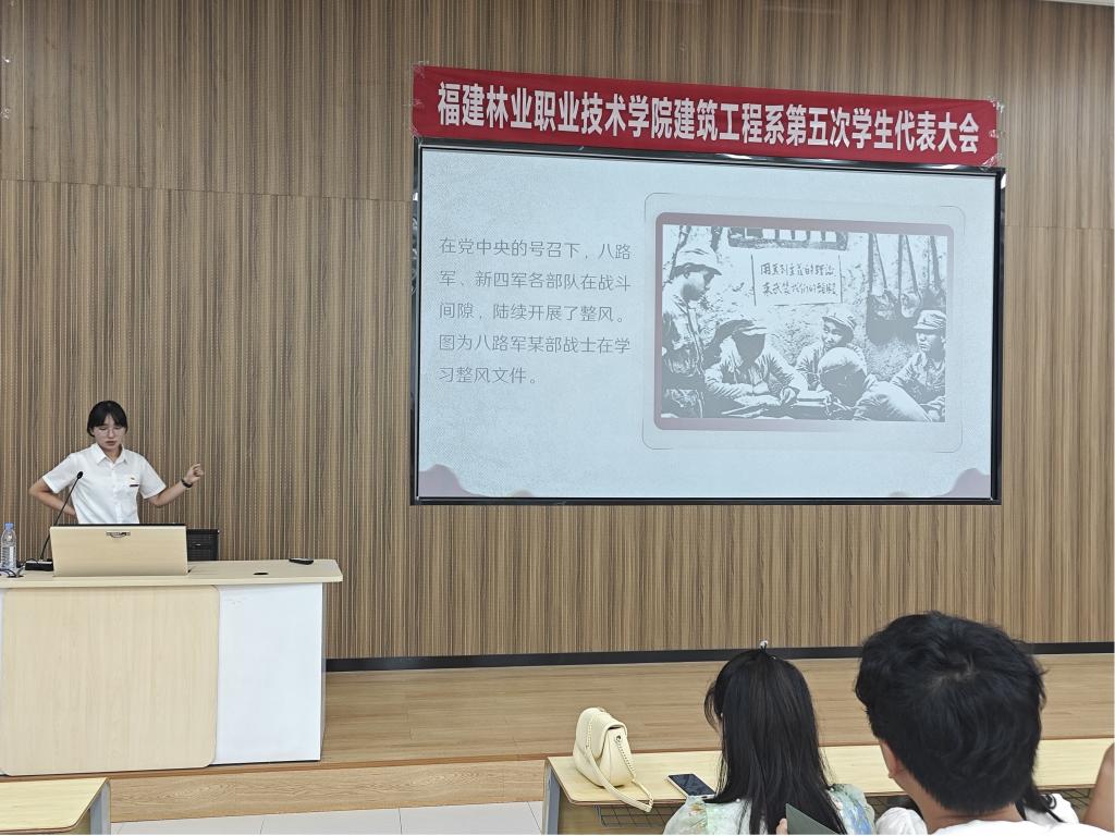本网讯/为了深入学习贯彻习近平新时代中国特色社会主义思想,贯彻落实党的二十届三中全会精神,根据中共中央办公厅印发的《关于在全党开展深入贯彻中央八项规定精神学习教育的通知》,2025年6月25日,福建林业职业技术学院建筑工程系学生第一党支部在阶梯教室二开展《久久为功担使命,清风化入青春怀——从中央八项规定看新时代青年党员的作风锤炼与使命传承》专题党课。本次党课由建筑工程系学生第一党支部书记陈慧婷主讲,全体师生党员参加。