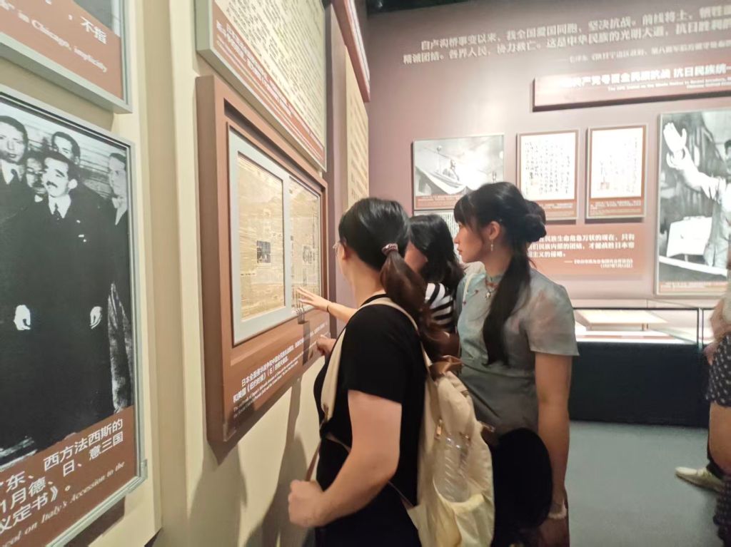 纪念馆庄严肃穆,《为了民族解放与世界和平——纪念中国人民抗日战争暨世界反法西斯战争胜利80周年》主题展览以“铭记历史、缅怀先烈、珍爱和平、开创未来”为主线,分八个部分全景式呈现14年艰苦卓绝的抗战史诗。党员教师依次走进“奋起抵抗”“全民族抗战”“中流砥柱”等展厅,在一幅幅珍贵照片、一件件斑驳文物、一段段震撼影像前驻足凝视,重温卢沟桥事变、平型关大捷、百团大战等重大历史节点,深刻体悟中国共产党在全民族抗战中的中流砥柱作用,深刻感受中华儿女以铮铮铁骨战强敌、以血肉之躯筑长城的浩然正气。