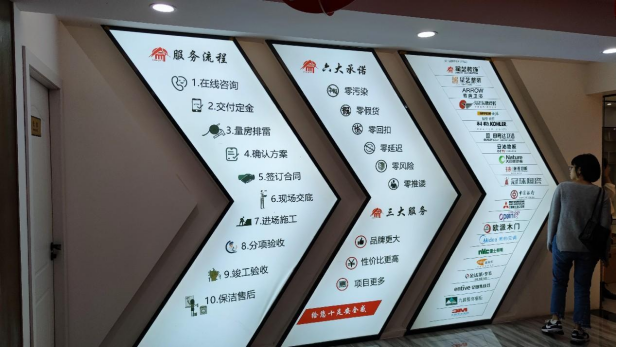 首先,入门所见的,是全屋定制工程的服务,以及主要合作品牌展示。对于现今社会,人们对装修的品质需求不断增高,一个一体化,具有资源集中作用的平台,在复杂的装修流程中显得尤为珍惜。对于材料属性、施工技术、软装配饰、效果表达等多方面领域的综合调控,也是社会对于新时代复合型人才的要求所在。