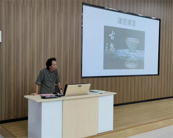 首先谢副院长向师生介绍了非遗传承人——杨敏先生简要概况,杨敏先生于1988年就读于福建林业学校,长年精心钻研土壤知识,后来又于2018年江南大学“艺术设计”专科毕业,东北师范大学“美术”专业2022年本科毕业。2014年先后创办南平市建阳区原色茶陶建盏陶瓷工作室和福建省鼎吉建盏陶瓷有限公司,先后获得7项国家外观专利及《鼎吉建盏》《潭阳鼎吉》二项商标,并发行多篇论文及个人专著《烧窑札记》。以烧制鹧鸪斑建盏为特长,创新烧制全釉建盏。目前所烧制大型鹧鸪斑油滴大器型在建盏界独树一帜。