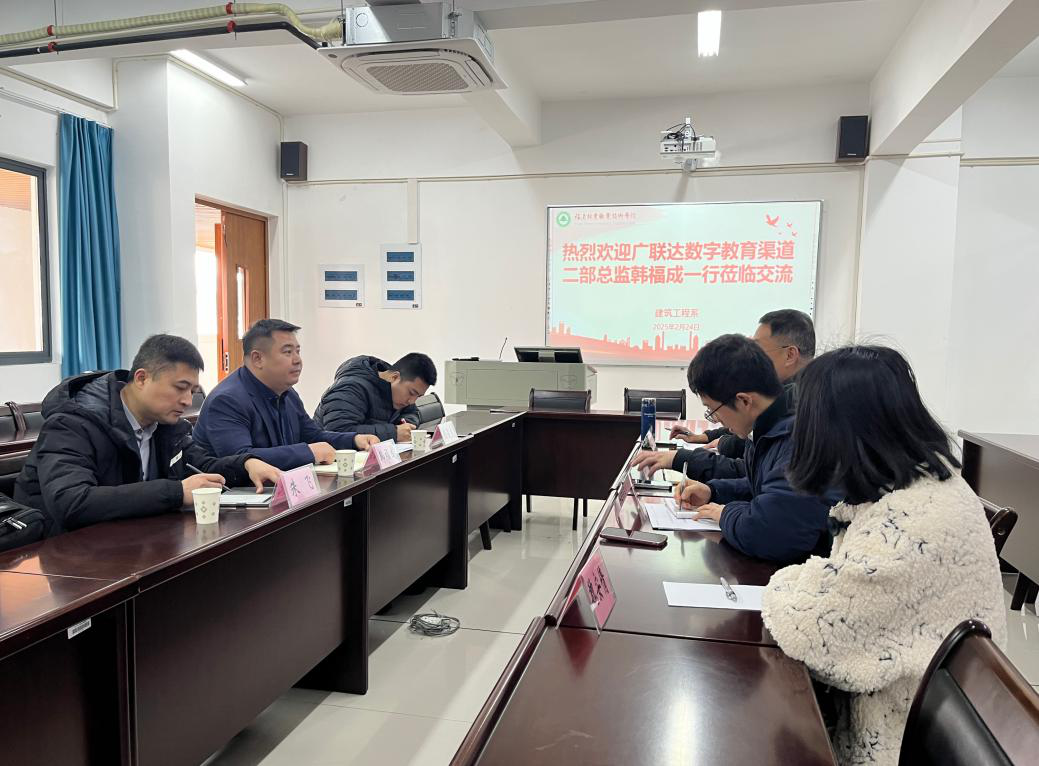 本网讯/2月24日,广联达数字教育渠道二部总监韩福成携团队访问福建林业职业技术学院建筑工程系,旨在推进智能建造产业学院及智能建造开放型闽台产教融合实践中心的建设进程。此次访问为双方提供了深度交流与合作的重要契机。建筑工程系主任彭忠伟、副主任张李平、教学科长廖坤阳及专任教师魏安倩参与了此次会议。