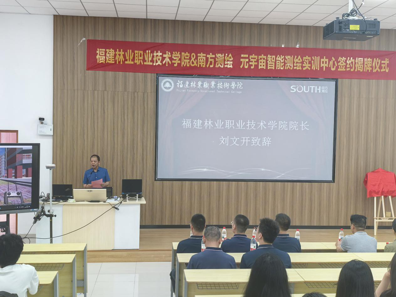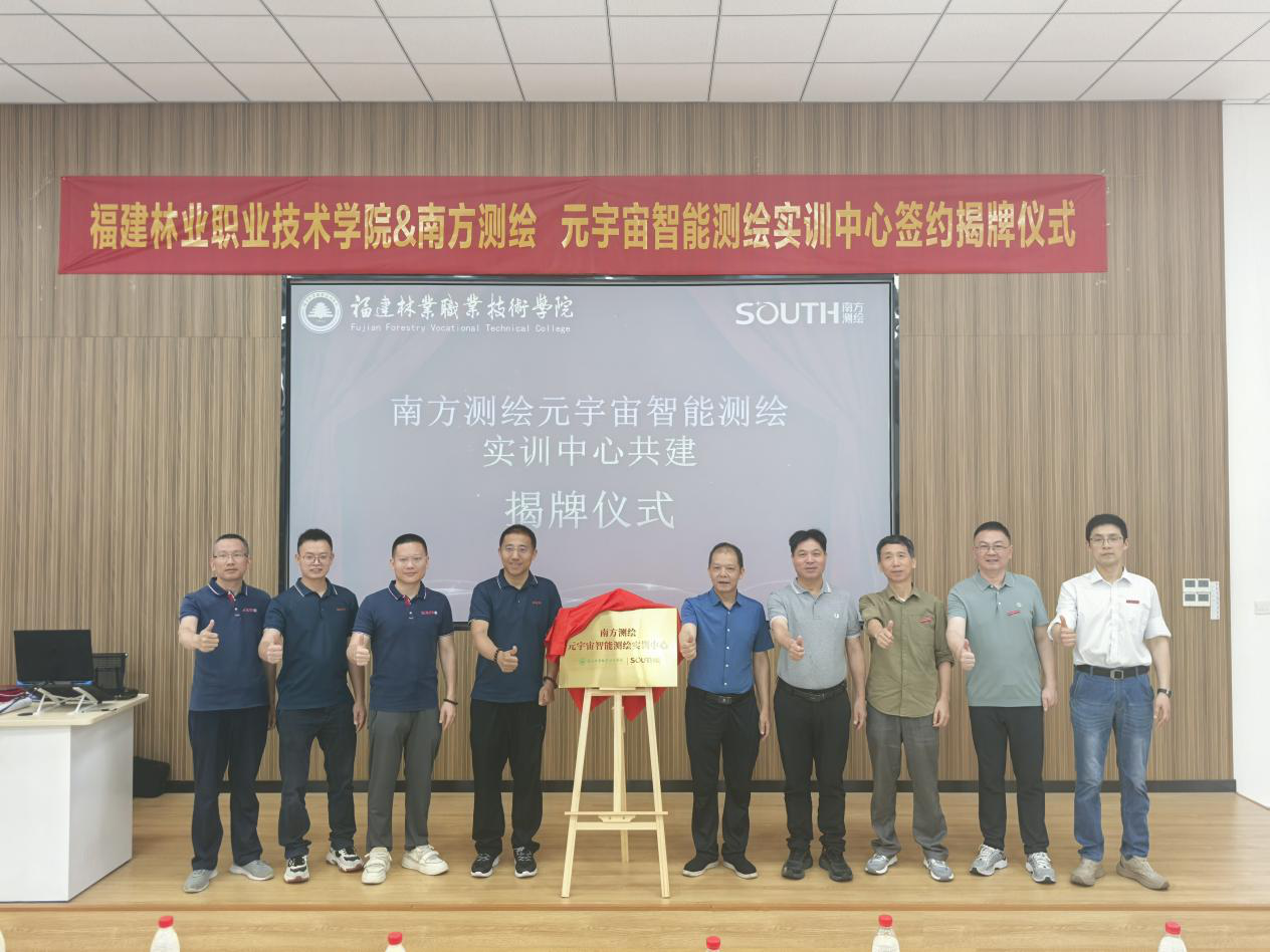 本网讯/2025年5月22日下午,南方测绘集团副总裁郭宝宇、南方测绘集团福州分公司总经理方明一行莅临福建林业职业技术学院建筑工程系,与学院领导、教师代表共同出席“元宇宙智能测绘实训中心”签约揭牌仪式,福建林业职业技术学院院长刘文开、党委副书记严绍裕、实训中心主任郭智华、建筑工程系主任彭忠伟及建筑工程系教研室主任、各专业负责人参与了此次交流。