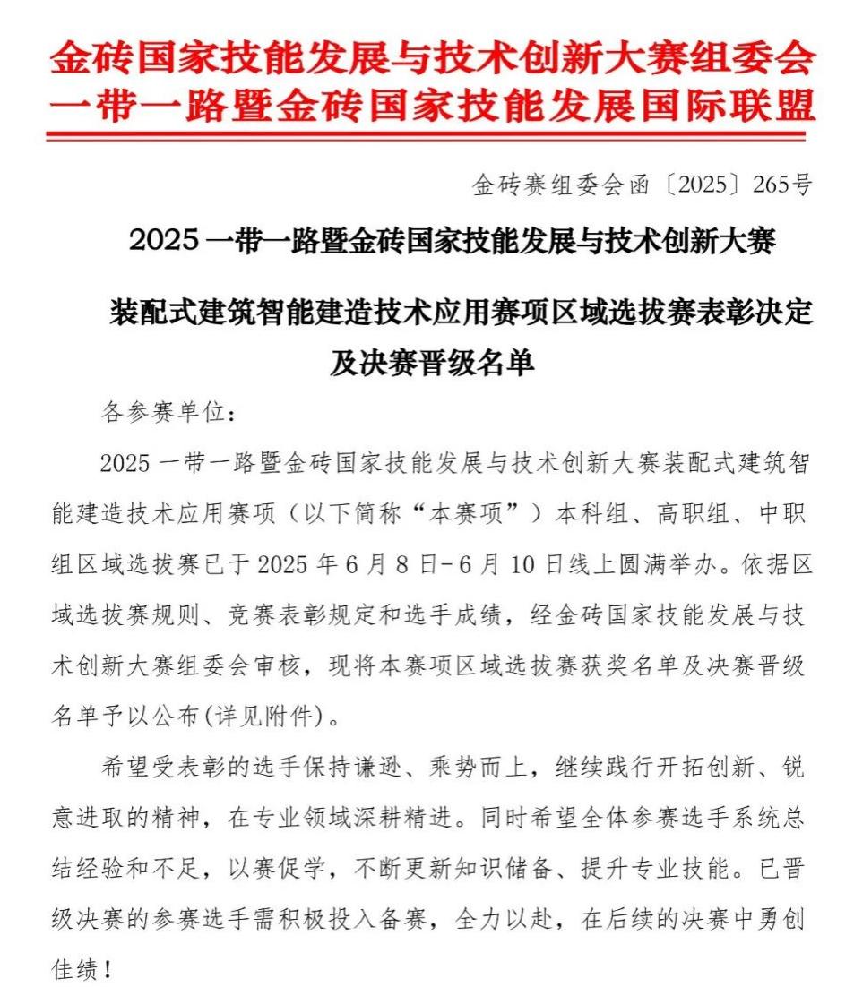 本网讯/2025年6月8日至10日,2025一带一路暨金砖国家技能发展与技术创新大赛装配式建筑智能建造技术应用赛项区域选拔赛在线上举行。本次高职组选拔赛共有来自全国32个省、自治区、直辖市的高职院校,共计321支代表队642名选手参加比赛。建筑工程系派出智能建造技术2303班林彬源、智能建造技术2303班熊喆昊同学荣获团体二等奖,智能建造技术2302班杨亿萍、智能建造技术2303班林泗春同学荣获团体三等奖。上述两队选手均顺利入围本赛项的全国总决赛。建筑工程系王兴、廖坤阳两位老师参与本项赛事的指导工作。