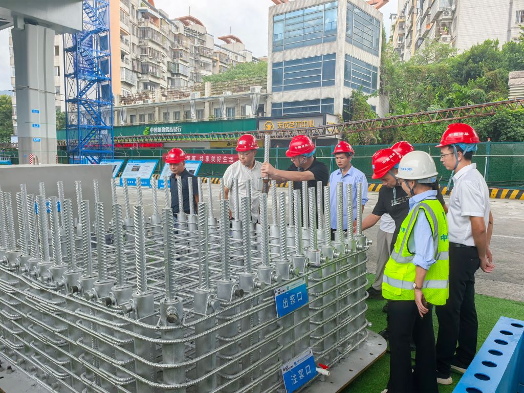 双方围绕项目的关键技术运用及取得成果展开深入探讨。通过交流了解到该项目工况复杂,项目技术团队首创福建省双曲花瓶异形预制墩柱施工工艺,通过BIM技术线型定位、模板平曲面分离设计等创新手段,解决了曲面结构钢筋加工精度不足、混凝土浇筑密实度控制难等行业痛点。该工艺实现大型构件工厂精细化预制,配合定制吊架吊装技术,成功破解超大型构件运输及安装误差控制难题,安装精度达2毫米级标准。