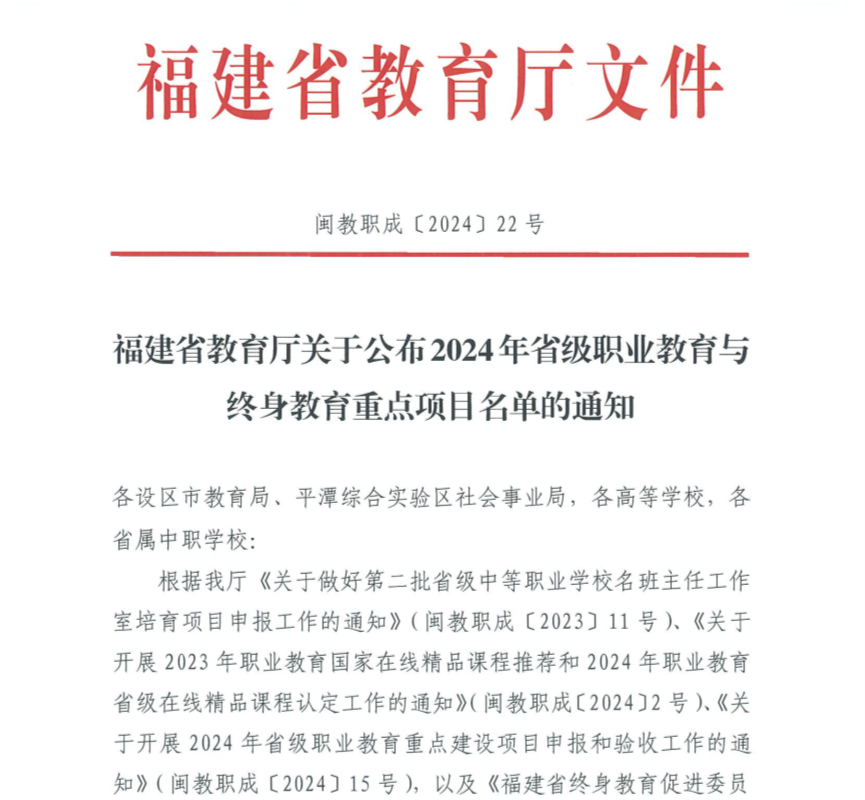 近日,福建省教育厅发布了《福建省教育厅关于公布2024年省级职业教育与终身教育重点项目名单的通知》(闽教职成〔2024〕22号),我校25个项目获批省级职业教育重点项目,其中省级职业教育课程思政示范课程2门,省级职业教育在线精品课程18门,省级闽台融合产业学院1个,省级开放型闽台产教融合实践中心1个,省级“海丝学院”1个,省级职业教育专业教学资源库认定1个,第六批省级职业教育专业教学资源库通过验收1项。此次获评省级职业教育重点项目创新高,是我校坚持“产教融合,校企合作”的人才培养模式改革,推进学校产教、科教深度融合的建设成效,是学校长期以来在教育教学改革道路上不懈探索与实践的结果。今后,学院将聚焦关键办学能力提升,继续推进产教融合、科教融汇,全力抓好“五金”新基建建设,推动学院的高质量发展。