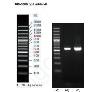 Fig. 2 Gel electrophoretic assay of the pathogenic fungi PCR fragments. (M), (a), and (b )represent Marker DL 2000, TF1, and TF2 amplification products, respectively