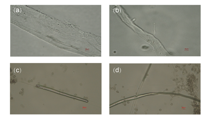 Fig. 1 Morphological characteristics of pathogenic fungi. (a) Cultures of strain TF1 on PDA. (b) The mycelium and conidia of strain TF1. (c) Cultures of strain TF2 on PDA. (d) The mycelium and conidia of strain TF2.