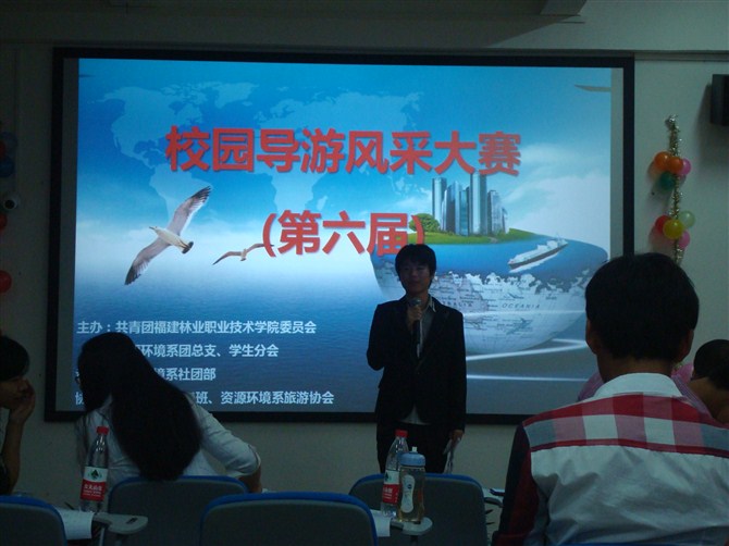 资环系于5月13日晚上,在实训一409导游实训室举办第六届校园导游风采大赛决赛。大赛中,选手们给我们展示了各地的风景,还有各种的才艺,如:小品,唱歌,舞蹈,武术等等。本次大赛有11人获奖。一等奖:旅游1105,韩阳;二等奖:生物1108,朱博蔚;旅游1105,傅丽娟;三等奖:旅游1105,郑慧玲,叶婷婷,杨佳烨;优秀奖:旅游1105,杨丹青,丁吓妹,陈麟蕾,林艺娜;园林工程1102,彭华敏。